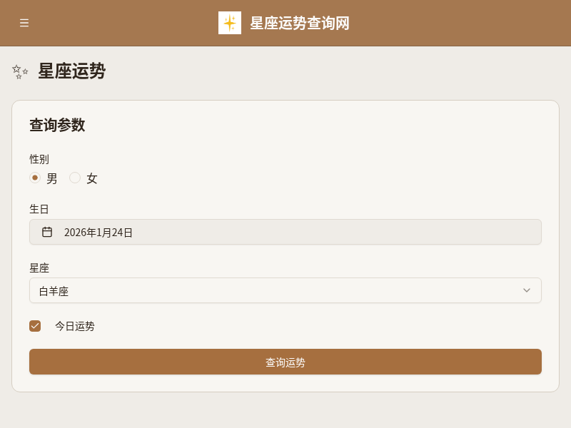 提供白羊座、金牛座、双子座、巨蟹座、狮子座、处女座、天秤座、天蝎座、射手座、摩羯座、水瓶座、双鱼座的每日运势查询服务。